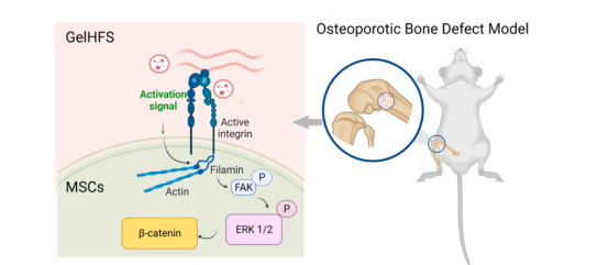 受愈合能力受损与愈合期延长的限制,骨质疏松性骨缺损对骨再生提出了重大挑战。为此,香港中文大学李刚教授团队联合华南理工大学边黎明教授团队开发了一种水凝胶(GelHFS),该水凝胶植入骨质疏松性骨缺损大鼠模型可募集内源性表达整合素β1的细胞,增强新骨形成和骨强度。