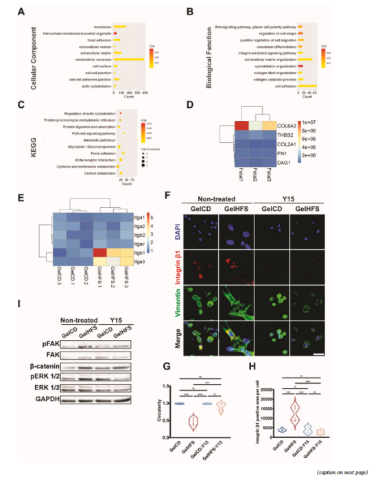 为了分析HFS中的蛋白质组成,研究者进行了蛋白质组学分析,发现大多数HFS组分来源于细胞外外泌体和细胞外基质。KEGG分析显示,HFS被注释为黏着斑途径(5%)和ECM-受体相互作用(3%)。此外,HFS中的显著ECM蛋白均可与整合素相互作用。为确定HFS调节的整合素亚基,研究者检测了在GelCD和GelHFS包封的MSC中整合素亚基的mRNA表达。结果显示,与GelCD组相比,GelHFS明显上调Itgb 1与Itga 3基因的表达。免疫荧光染色进一步证实了GelHFS上调MSC中整合素β1的表达。此外,WB结果证实,GelHFS上调了MSC中β-连环蛋白的蛋白质表达并激活了FAK-ERK信号通路,而这种增加被FAK抑制剂Y15消除。以上结果表明,GelHFS可通过MSC中整合素β1和HFS(ECM组分)之间的相互作用来促进细胞快速铺展和成骨分化(图3)。