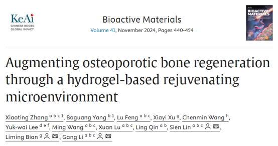 论文信息:Xiaoting Zhang1, Boguang Yang1, Lu Feng, Xiayi Xu, Chenmin Wang, Yuk-wai Lee, Ming Wang, Xuan Lu, Ling Qin a,b, Sien Lin**, Liming Bian***, Gang Li*. Augmenting osteoporotic bone regeneration through a hydrogel-based rejuvenating microenvironment. Bioactive Materials 41 (2024) 440–454.