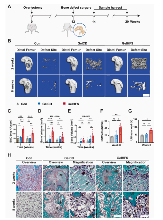 紧接着,研究者在雌性大鼠中建立了卵巢切除术诱导的骨质疏松模型,并通过Micro-CT和组织学染色来评估了GelHFS促进骨再生的有效性。结果显示,GelHFS组在两周内表现出更多的骨样组织形成,8周后出现明显矿化,生物力学测试表明GelHFS不仅支持骨愈合,而且增强了新生骨的刚度和极限载荷。组织学结果显示,对照组几乎无新骨形成,在GelHFS组中,编织骨在2周内取代了大部分水凝胶和纤维组织,到8周时,编织骨已经重塑为成熟的板层骨。以上结果共同表明,GelHFS显著增强了骨质疏松性骨缺损的再生,包括促进新骨形成和提高骨力学性能(图4)。