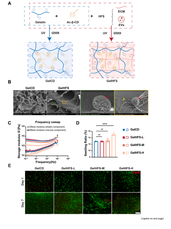 首先,研究者以合成的丙烯酰基β-环糊精(Ac-β-CD)为主体单体,通过光聚合反应与明胶反应得到主客体水凝胶(GelCD),然后将人类胎儿间充质干细胞分泌物(HFS)掺入GelCD前体中制备了GelHFS水凝胶。HFS组分可保持其纳米球形态,均匀分布在水凝胶内,两种水凝胶均具孔径为100μm的大孔结构。此外,GelHFS水凝胶中,低浓度的HFS不影响水凝胶的储能模量和溶胀比,并对水凝胶包封的MSC具有较好的生物相容性(图1)。