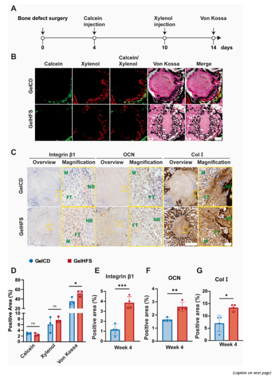 为观察新骨形成的动态过程,研究者测量了体内钙黄绿素和二甲苯酚的双标定,结果显示GelCD组和GelHFS组术后10天的骨形成无统计学差异,但GelHFS组术后第14天的新骨形成明显高于GelCD组,之后对缺损部位进行连续切片免疫组化染色,结果提示, GelHFS组在缺陷部位对整合素β1、OCN和Col -I的阳性染色明显高于GelCD组。以上结果表明GelHFS可将更多表达整合素β1的细胞募集到缺损部位,促进内源性细胞成骨,从而产生更多的骨基质沉积(图5)。