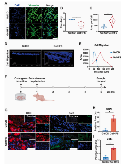 接着,研究者使用共聚焦显微镜成像重建包封细胞的3D结构,研究了大鼠骨髓间充质干细胞(MSC)在GelCD和GelHFS中的行为。GelHFS可促进细胞迁移,其包封的MSC具有更显著的伸展和细胞骨架中间丝(波形蛋白),呈现梭形样形状,且单个细胞的面积明显大于GelCD组。GelHFS可促进MSC浸润至凝胶内部,而GelCD 组细胞大多保留在凝胶表面。